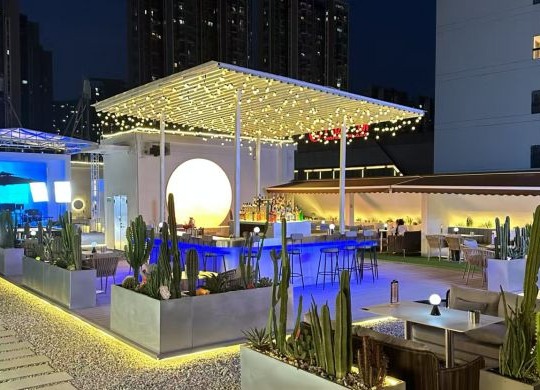 【黄金地段宝藏店铺转让】广州黄埔区南岗万达旁·1500㎡地中海风情复合空间 【核心优势】 ▸绝佳区位:广州黄埔区南岗万达广场旁,地铁站仅800米,坐拥成熟商圈+社区流量 ▸环境配置:1500㎡超大天台空间,地中海蓝白风情设计,绿植环绕,俯瞰城市夜景